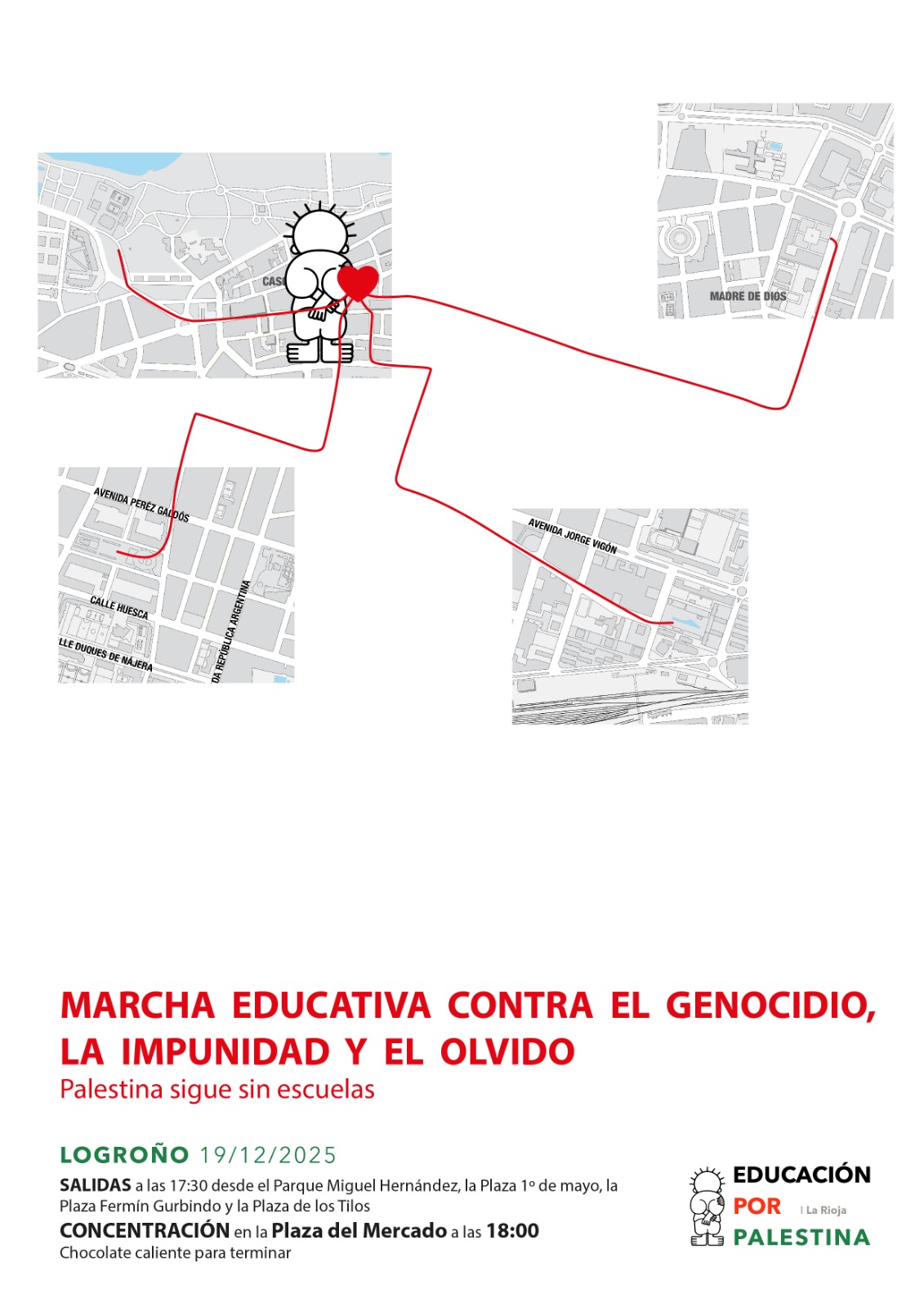 - Viernes 19 de diciembre, marcha organizada por Educación por Palestina – La Rioja desde distintos centros educativos hasta la Plaza del Mercado, donde se celebrará una concentración a las 18:00 horas con chocolatada abierta a todos los públicos. Más información aquí.