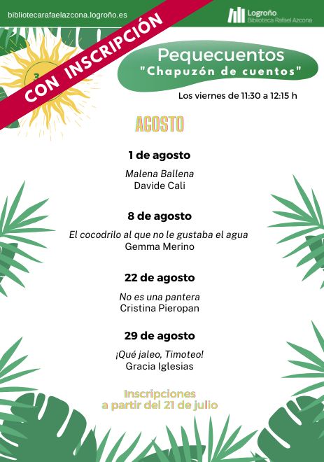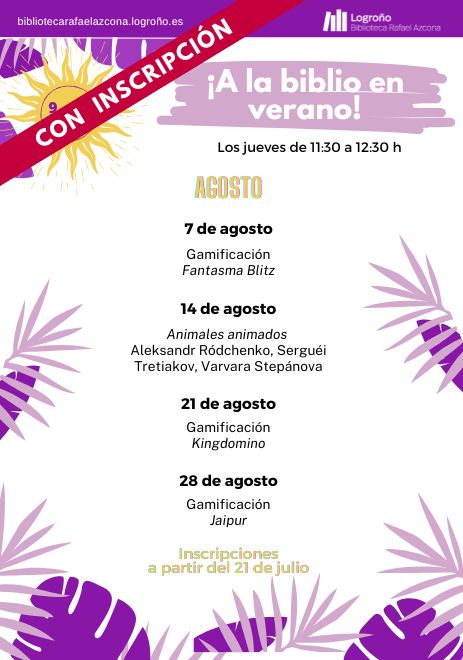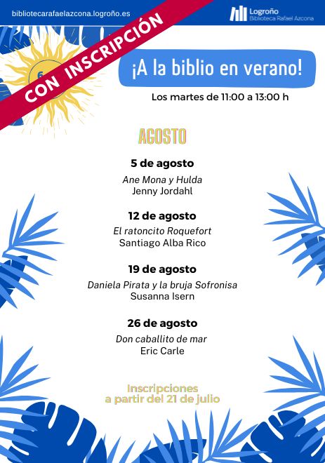 Inscripciones talleres agosto: a partir del 21 de julio a las 09.00 horas. Se podrá realizar por internet desde la página web a través de este enlace, en la recepción de la Biblioteca Rafael Azcona o llamando al 941 245 811.