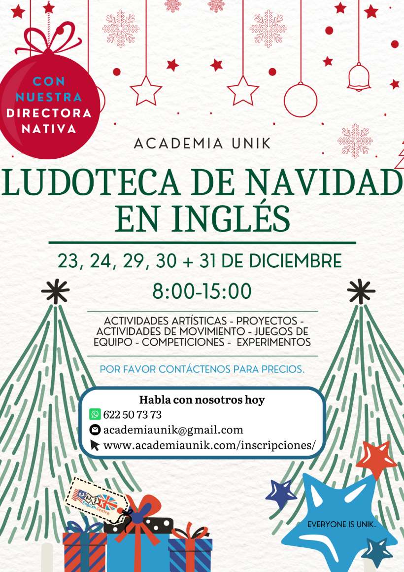 La Navidad es una época para descansar del colegio, soñar con los regalos y pasarlo bien. En UNIK English Centre han organizado una ludoteca de Navidad para las vacaciones escolares con actividades lúdicas que les servirán para practicar su inglés, en compañía de docentes nativos o bilingües