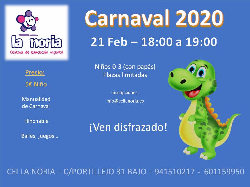 Desde el Centro de Educación Infantil La Noria (c/Portillejo, 31) nos hacen llegar esta original propuesta para Carnaval. Si quieres disfrazar a tu bebé (0-3 años) y divertirte con él y en compañía de otras familias con bebés, el viernes 21 de febrero han organizado una fiesta de Carnaval para los más pequeños.