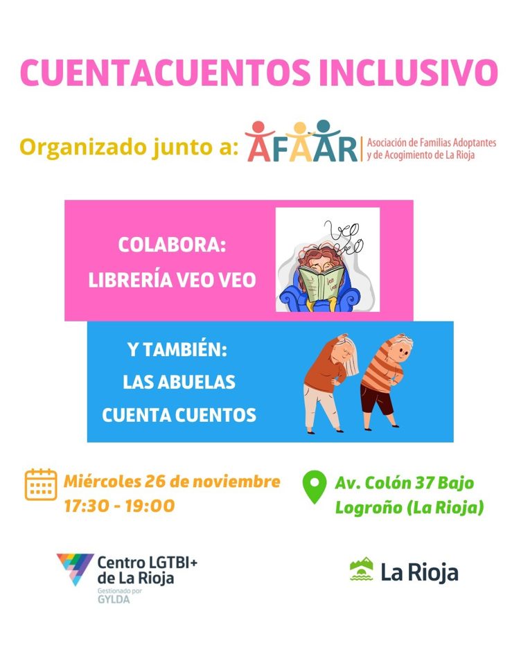 Este cuentacuentos inclusivo en familia se celebrará el miércoles 26 de noviembre, a las 17:30 horas, en la sede del Centro LGTBI+ de La Rioja (avenida de Colón 47, bajo).