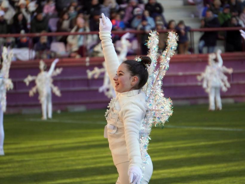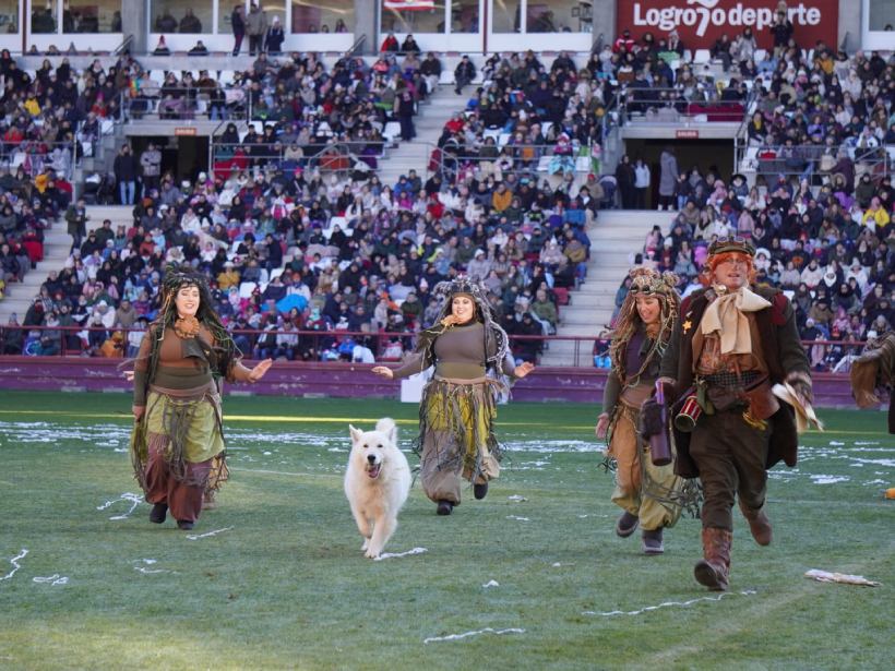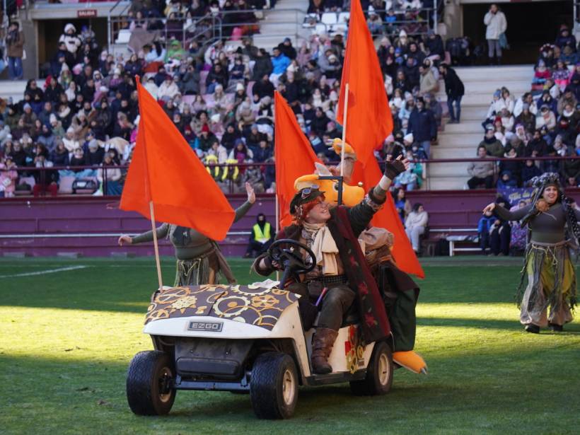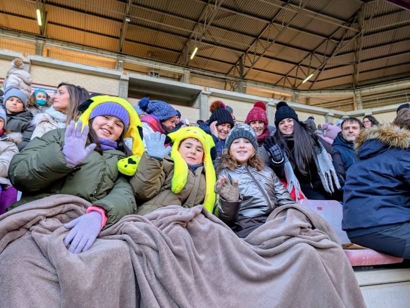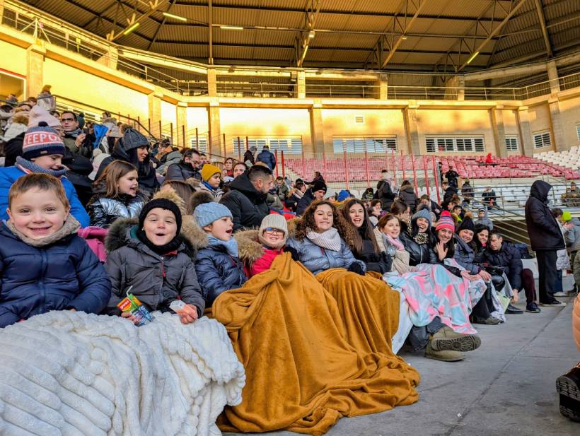 Algunas puertas del estadio municipal de Las Gaunas se han abierto minutos antes de las 9.00 horas, y ya se percibe el ambiente de nervios e ilusión en los alrededores. Familias enteras, muchas de ellas con niñas y niños bien abrigados, comienzan a ocupar los asientos para no perderse la llegada de Melchor, Gaspar y Baltasar.