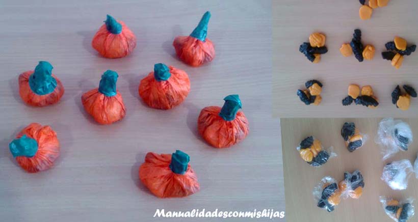 Ahora nos toca envolver las gominolas en papel de seda naranja haciendo paquetitos que asimilen una calabaza, quedando como un “rabito” naranja hacia un lado.