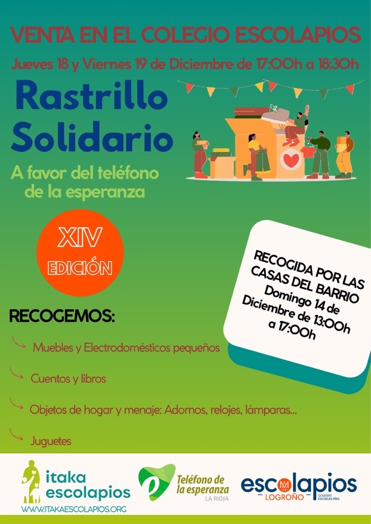 Como cada año, ponemos en marcha nuestro Rastrillo Solidario, para el que recogeremos pequeños muebles y electrodomésticos, libros, CDs, DVDs, videojuegos, objetos de hogar-menaje (adornos, cerámica, relojes, lámparas…) y juguetes. Los objetos podrán entregarse en el colegio Escolapios de Logroño y se pondrán a la venta en el rastrillo solidario, que se realizará los días 18 y 19 de diciembre, de 17:00 h a 18:30 horas, en el patio del centro escolar.