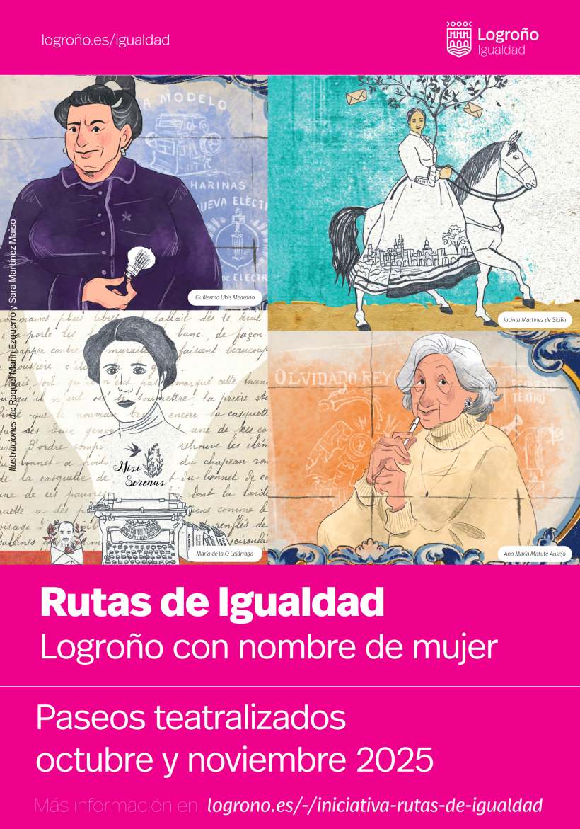 El Ayuntamiento Logroño organiza para los próximos meses de octubre y noviembre una nueva edición de las Rutas de la Igualdad, tres paseos teatralizados y gratuitos para dar a conocer el papel de mujeres logroñesas más destacadas de todas las épocas. El objetivo es pasear por nuestras calles poniendo en valor a las mujeres logroñesas que, a lo largo de la historia, han destacado en diferentes ámbitos, culturales, científicos, empresariales, deportivos u otros.