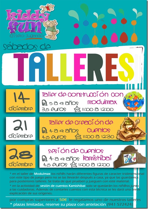 Durante el mes de diciembre, la juguetería Kiddy Fun organizará talleres lúdicos durante las mañanas de los sábados. En total se realizarán tres talleres diferentes: taller de construcción con modulmax, creación de cuentos y un cuentacuentos Kamishibai.